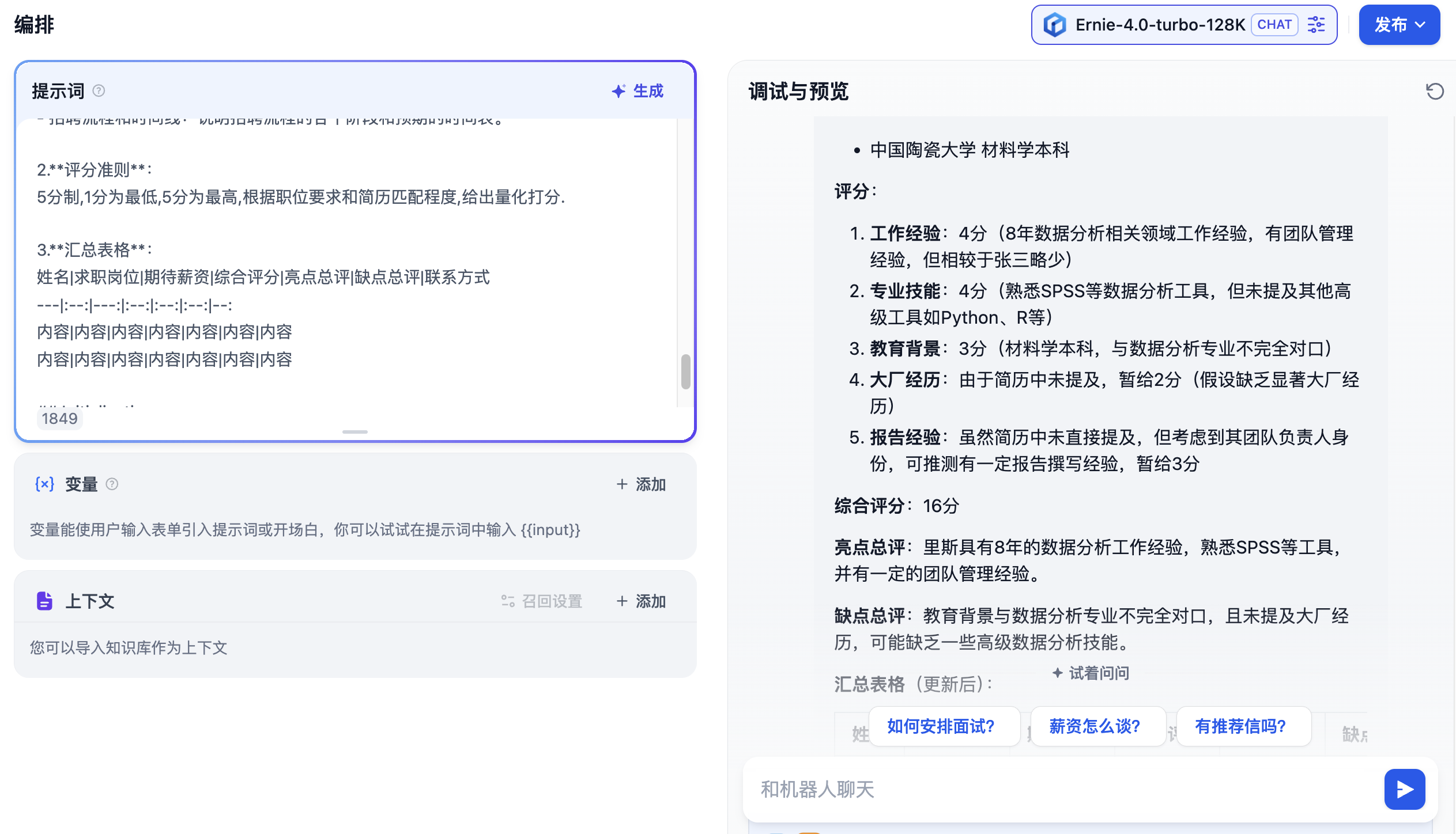 - 步骤三,请根据人事经理的需求一步步思考,并形成初步的筛选标准,记住这很关键,这将成为后面对该应聘者的打分基础,接着将输出“评分标准”,并向产品经理进行确认,是否需要进行修改,若有特殊修改请进行修改并输出直至用户满意后我们将进行第四步。